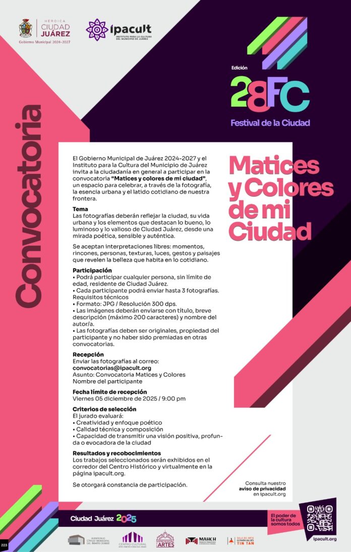 Ciudad Juárez, Chih. (ADN/Staff) – El Instituto para la Cultura del Municipio de Juárez (IPACULT) lanzó la convocatoria “Matices y Colores de mi Ciudad”, un llamado abierto a la ciudadanía para que, a través de la fotografía, plasmen la esencia, los contrastes y la belleza cotidiana de esta frontera. La iniciativa forma parte de la edición 28 del Festival de la Ciudad y busca reunir miradas auténticas que celebren la identidad juarense.