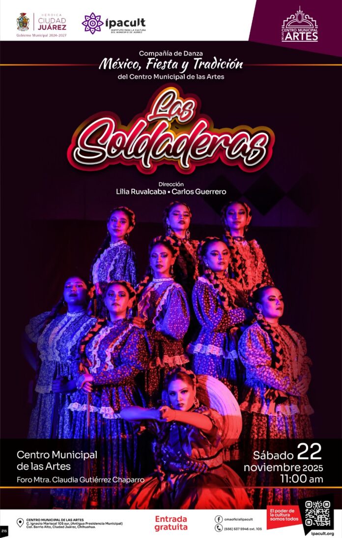 Ciudad Juárez, Chih. (ADN/Staff) – Como parte de las actividades conmemorativas del mes revolucionario y con el objetivo de reivindicar el legado de las mujeres en la historia de México, el Instituto para la Cultura del Municipio de Juárez (IPACULT) presentará este sábado 22 de noviembre el espectáculo de danza “Las Soldaderas”, en punto de las 11:00 de la mañana, en el foro Mtra. Claudia Gutiérrez Chaparro del Centro Municipal de las Artes (CMA).