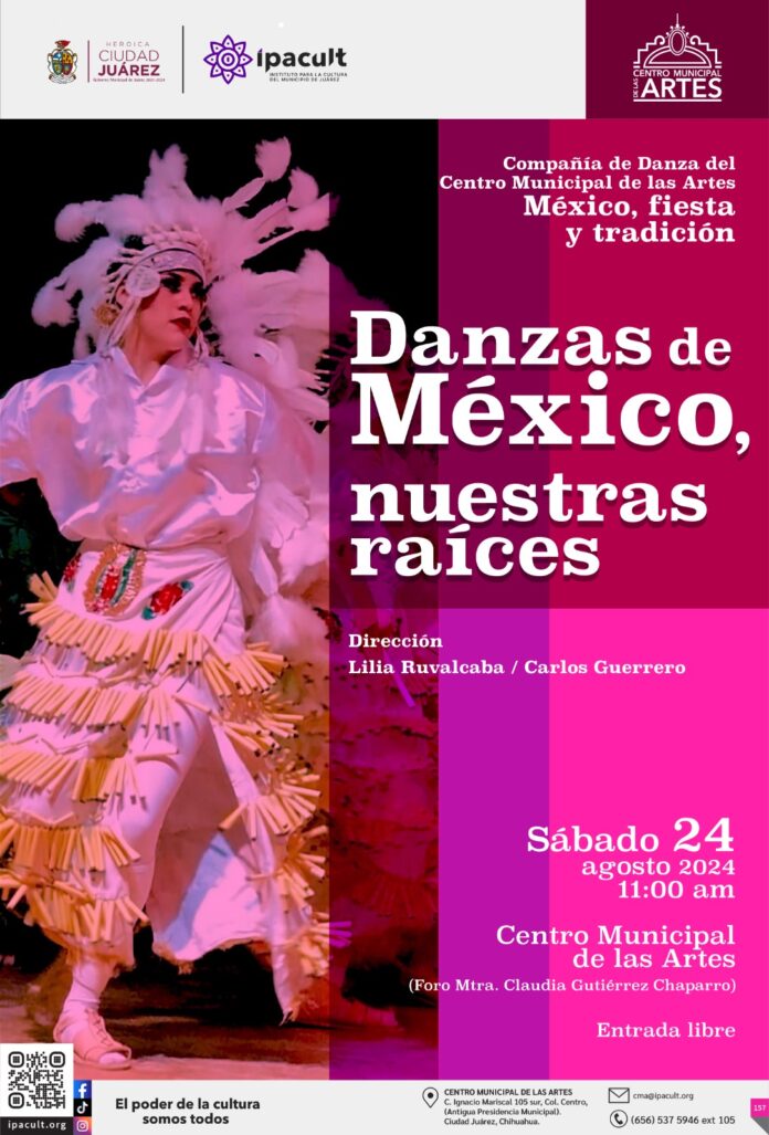 El Instituto para la Cultura del Municipio de Juárez (IPACULT) extiende una cordial invitación a toda la comunidad para asistir al evento “Danzas de México, Nuestras Raíces”, que se llevará a cabo este sábado a las 11:00 de la mañana en el foro “Claudia Gutiérrez” del Centro Municipal de las Artes (CMA).