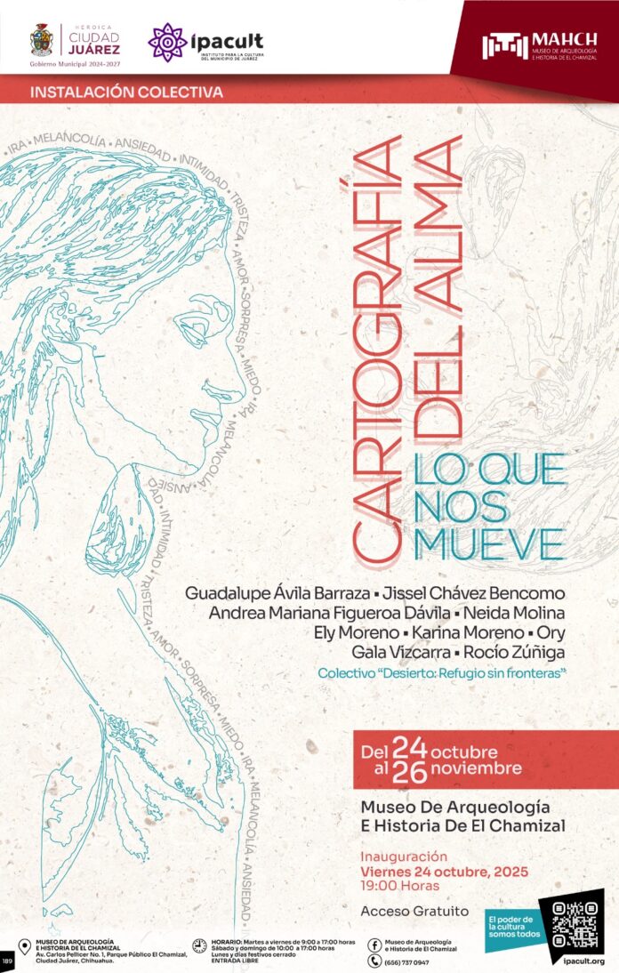 El arte se convierte en espejo de las emociones humanas con la exposición “Cartografía del Alma: Lo que nos mueve”, una propuesta del Colectivo Desierto Refugio Sin Fronteras que será inaugurada mañana viernes 24 a las 7:00 de la tarde en el Museo de Arqueología e Historia de El Chamizal (MAHCH), bajo la organización del Instituto para la Cultura del Municipio de Juárez (IPACULT).