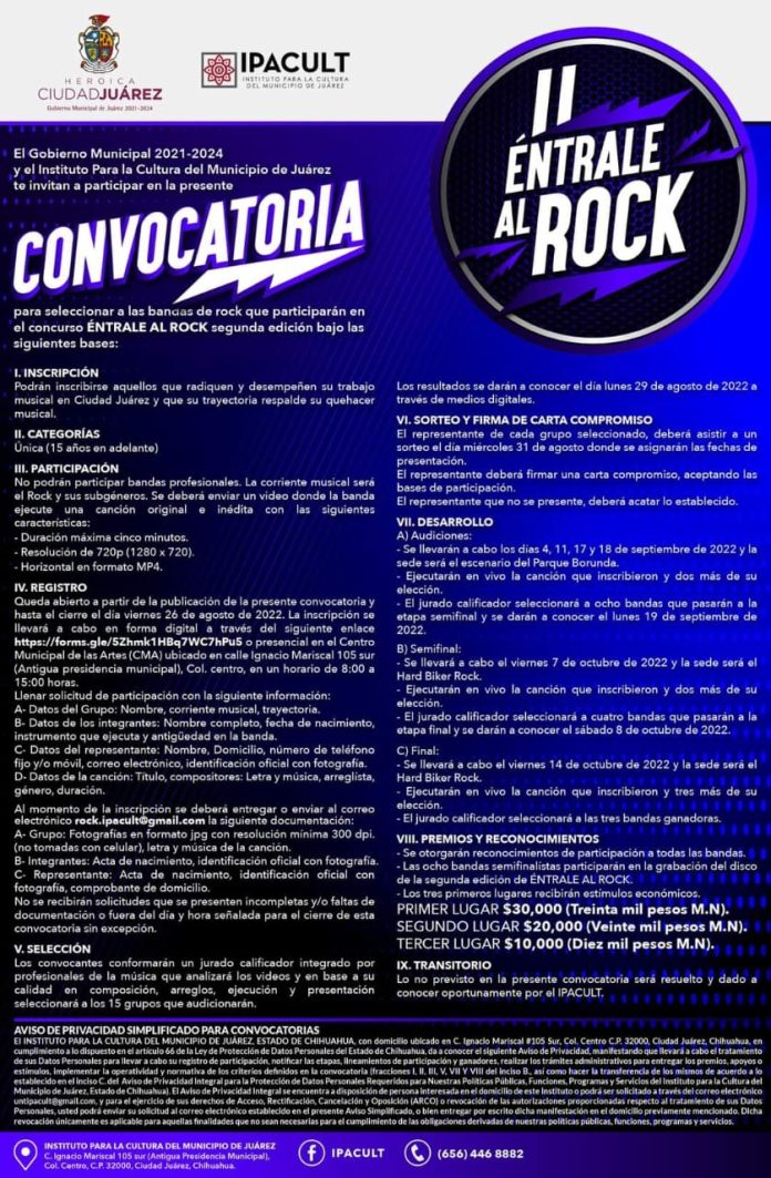 Ciudad Juárez, Chih .- Podrán participar todas las personas mayores de 15 años de edad que desempeñen su trabajo musical en Ciudad Juárez y que su trayectoria respalde su quehacer musical. Los interesados deberán enviar un video en formato MP4 (captura horizontal), donde la agrupación ejecute una canción original e inédita con duración máxima de 5 minutos.