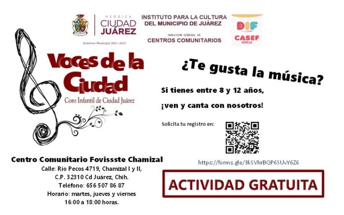 Ciudad Juárez, Chih .- El programa está dirigido a la población infantil de 8 a 12 años que desee formar parte del Coro Monumental de la Ciudad.