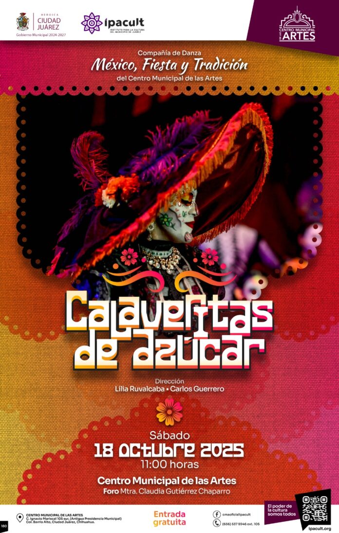 El Instituto para la Cultura del Municipio de Juárez (IPACULT) invita a la ciudadanía a disfrutar del espectáculo de danza “Calaveritas de azúcar”, una puesta en escena llena de color, tradición y movimiento que se presentará este sábado 18 de octubre a las 11:00 de la mañana en el foro Mtra. Claudia Gutiérrez Chaparro del Centro Municipal de las Artes (CMA).