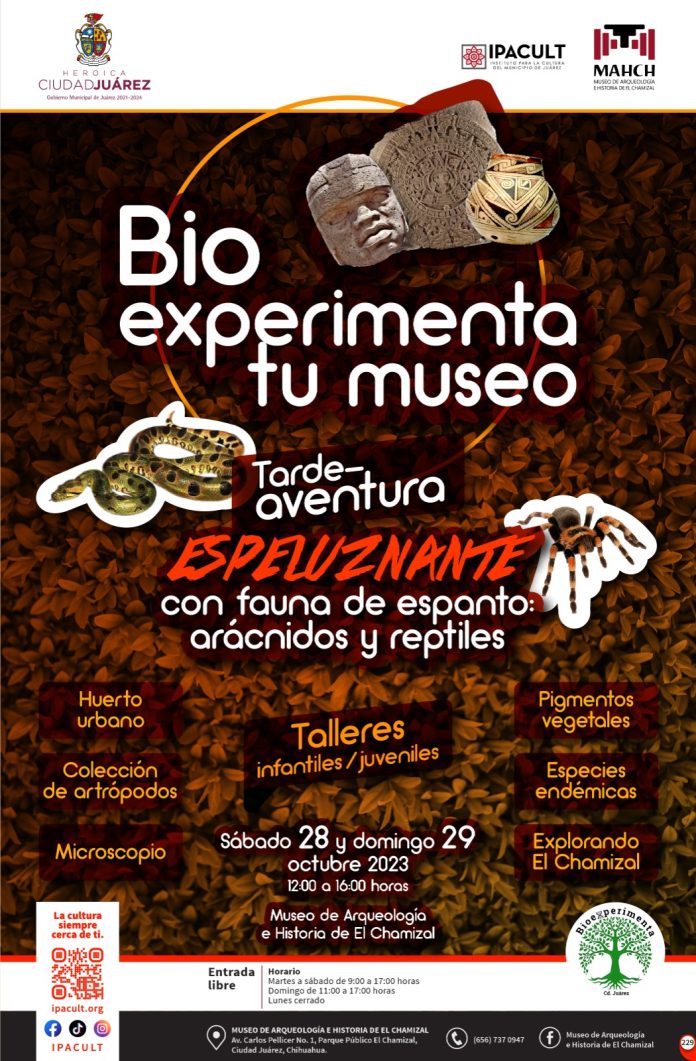 Desde las 12:00 del mediodía y hasta las 4:00 de la tarde, las actividades se realizarán en este recinto cultural ubicado en la calle Carlos Pellicer número 1, en el interior del parque El Chamizal, donde pasarán una tarde alusiva a la celebración de Halloween, por lo que será espeluznante con fauna de espanto, arácnidos y reptiles.