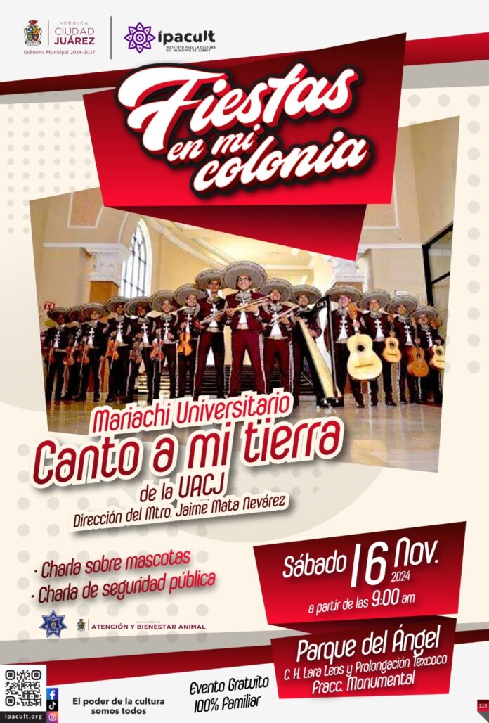 El Instituto para la Cultura del Municipio de Juárez (IPACULT) extiende una cordial invitación a toda la ciudadanía para asistir a “Fiestas en mi Colonia,” un evento comunitario que se celebrará el sábado 16 de noviembre en el Parque del Ángel, ubicado en el fraccionamiento Monumental.