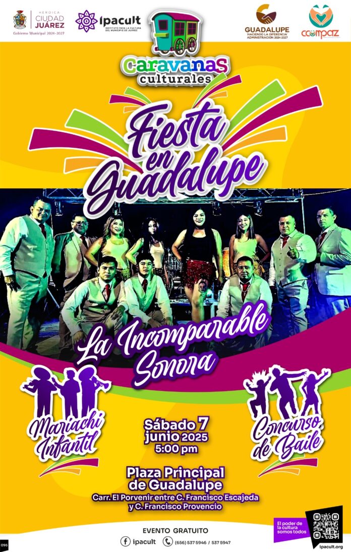 El Instituto para la Cultura del Municipio de Juárez (IPACULT) presentará este sábado 7 de junio, en el municipio de Guadalupe, el evento “Fiesta en Guadalupe”, como parte de su programa Caravanas Culturales, una iniciativa que busca acercar el arte y la cultura a las comunidades de la región.