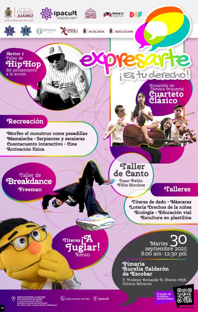 Con el firme propósito de acercar el arte y la cultura a la niñez juarense, el Instituto para la Cultura del Municipio de Juárez (IPACULT) llevará este martes 30 de septiembre a la Escuela Primaria Aurelia Calderón de Escobar su programa “Expresarte ¡es tu derecho!”, una iniciativa que combina creatividad, diversión y aprendizaje sobre los derechos de la infancia.