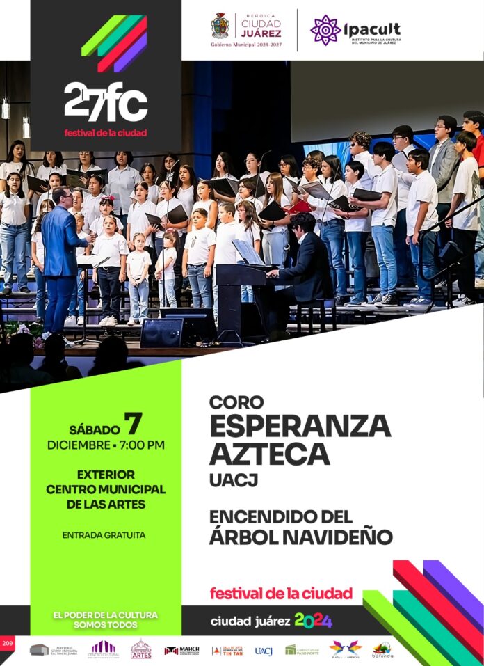 Ciudad Juárez, Chih .- La cita es en el Centro Municipal de las Artes (CMA), ubicado en el Centro Histórico, donde se llevará a cabo el tradicional encendido del árbol navideño acompañado de un concierto del Coro Esperanza Azteca de la Universidad Autónoma de Ciudad Juárez (UACJ).