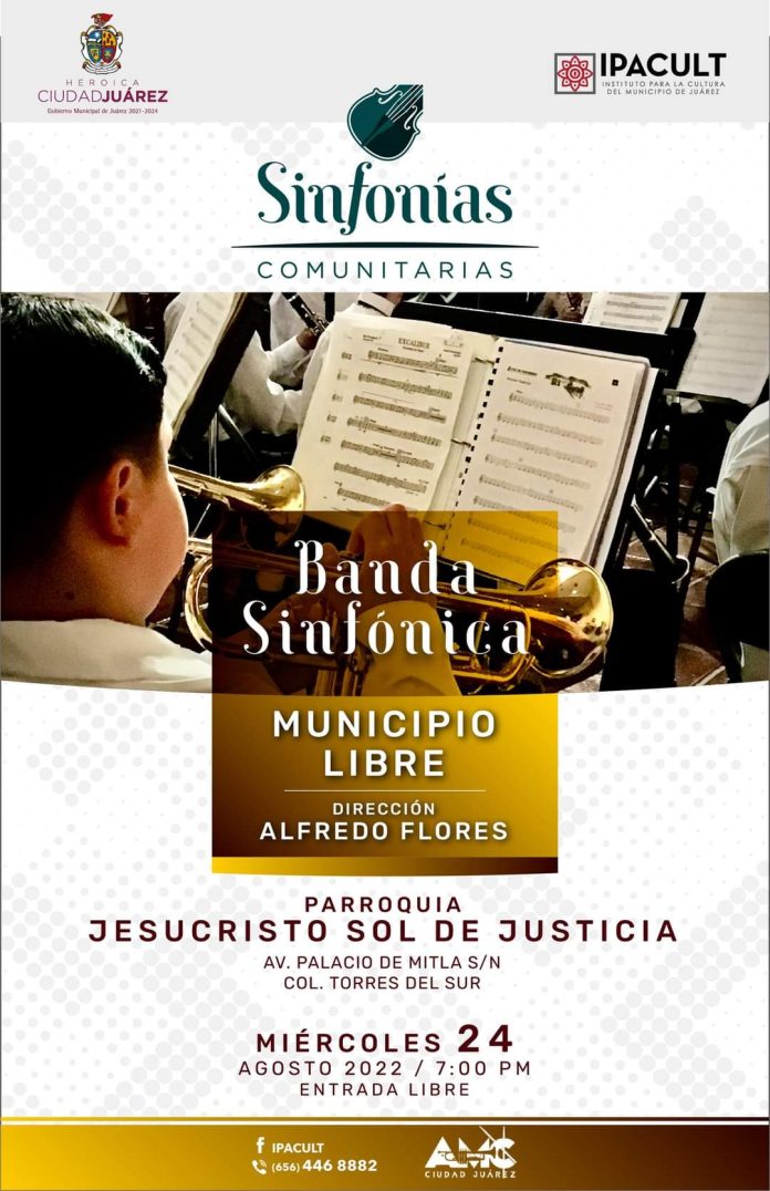 Ciudad Juárez, Chih .- Formada por 30 alumnos de entre 7 y 17 años, la Banda Sinfónica Municipio Libre se presenta bajo la dirección de Alfredo Flores, a las 7:00 de la tarde en un concierto con entrada libre y en el que los niños y jóvenes darán a conocer sus avances en la práctica y destreza dentro del arte musical, dijo el director del IPACULT, Miguel Ángel Mendoza Rangel.