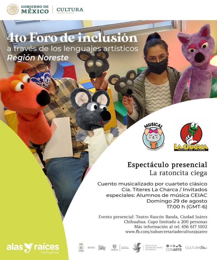 Ciudad Juárez, Chih .– La Subsecretaría de Cultura Zona Norte invita a la comunidad fronteriza a disfrutar de la obra de teatro de títeres “La ratoncita ciega” de la compañía La Charca, un espectáculo presencial musicalizado por El Cuarteto Clásico, en el marco del 4to Foro de inclusión a través de los lenguajes artísticos: región noreste de la Secretaría de Cultura federal y Alas y Raíces Chihuahua.