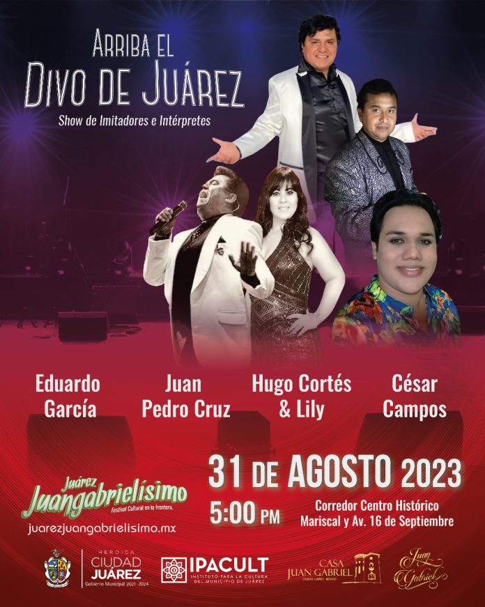Ciudad Juárez, Chih .- Para mañana 31 de agosto, dentro del festival cultural Juárez “Juangabrielísimo”, se presentará el espectáculo “Arriba el Divo de Juárez”, que trae a imitadores e intérpretes del cantautor mexicano reconocido a nivel internacional.