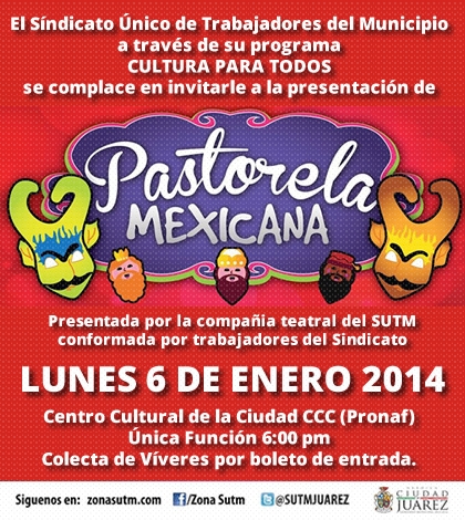 Con el fin de promover y fomentar actividades culturales entre los sindicalizados municipales, el Sindicato Unico de Trabajadores del Municipio invita a la comunidad en general a la presentación de la obra de teatro “Pastorela Mexicana”, donde se trataran ademas de la clásica historia decembrina, temas sobre los valores más auténticos de la cultura nacional.