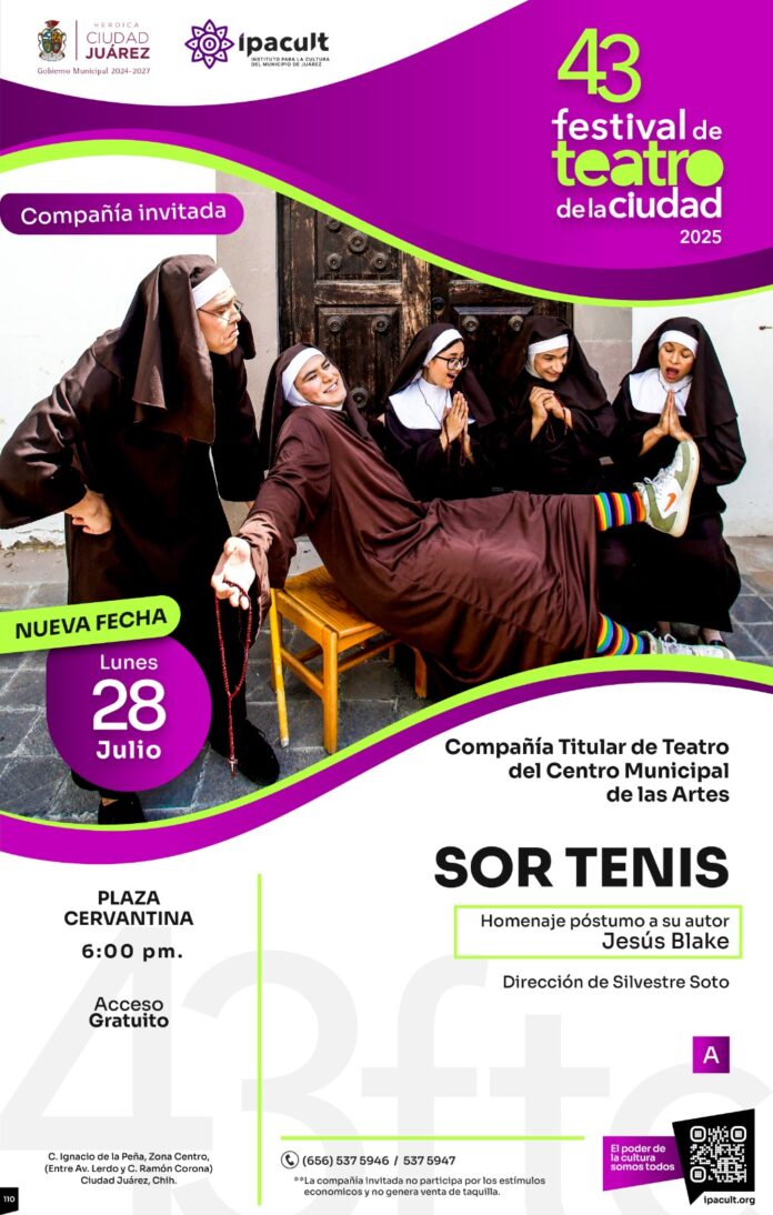 El Instituto para la Cultura del Municipio de Juárez (IPACULT) informa que debido a las condiciones climatológicas que se presentan en la ciudad, la función inaugural del Festival de Teatro de la Ciudad con la obra “Sor Tenis” ha sido reprogramada.
