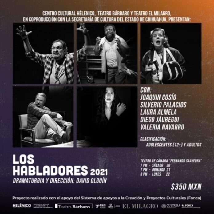 Ciudad Juárez / Chihuahua, Chih .- El Gobierno del Estado a través de la Secretaría de Cultura de Chihuahua en coordinación con la Red de Teatros y en co-producción con Centro Cultural Helénico, Teatro El Milagro y A.C.Teatros ANTI invitan a presenciar la puesta en escena “Los Habladores” la cual se exhibirá los días 20 y 21 a las 7 pm y 22 a las 8 pm en el Teatro de Cámara para Chihuahua y del 24 al 27 de noviembre en punto de las 7:30 pm en el Centro Cultural Paso del Norte para Ciudad Juárez.
