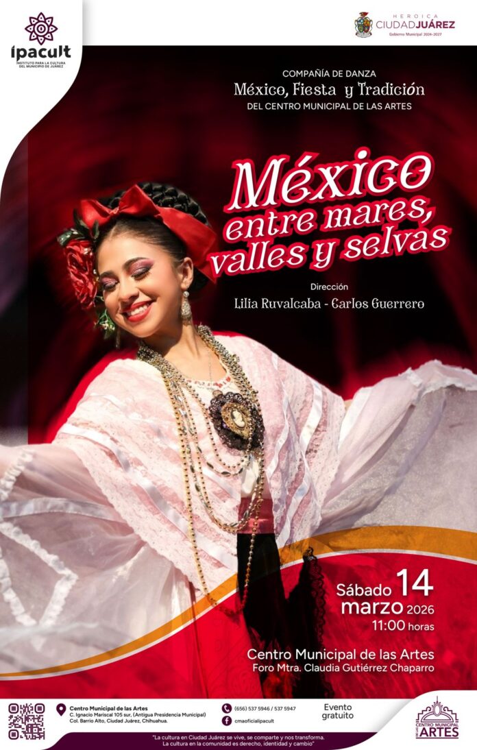Ciudad Juárez, Chih. (ADN/Staff) – El Centro Municipal de las Artes (CMA) presentará el espectáculo de danza folklórica “México, entre mares, valles y selvas”, a cargo de la Compañía de Danza México, Fiesta y Tradición, como parte de las actividades culturales promovidas por el Instituto para la Cultura del Municipio de Juárez (IPACULT).