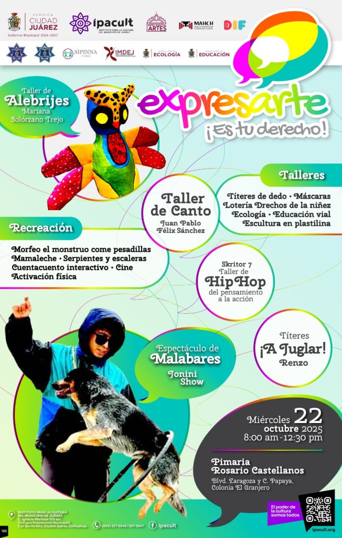 Con la firme intención de que las niñas y los niños conozcan y ejerzan sus derechos, el Instituto para la Cultura del Municipio de Juárez (IPACULT) llevará este miércoles 22 de octubre su programa “Expresarte ¡es tu derecho!” a la Escuela Primaria Rosario Castellanos, donde a partir de las 8:00 de la mañana se desarrollará una jornada artística y educativa.
