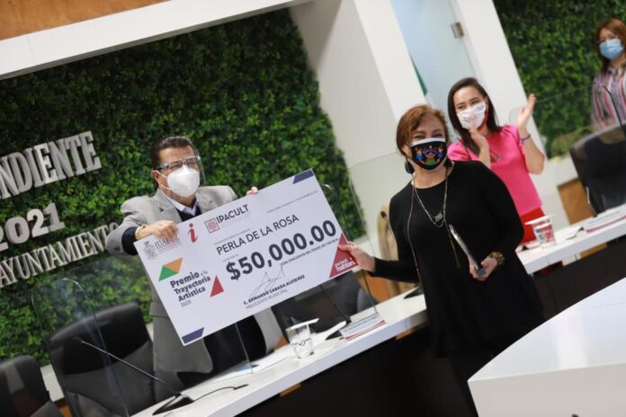 Ciudad Juárez, Chih. – En la Sesión Solemne de Cabildo 93, integrantes el Honorable Ayuntamiento entregaron esta tarde el Premio a la Trayectoria Artística 2020, a la actriz Perla de la Rosa, por su labor, dedicación y promoción del teatro.