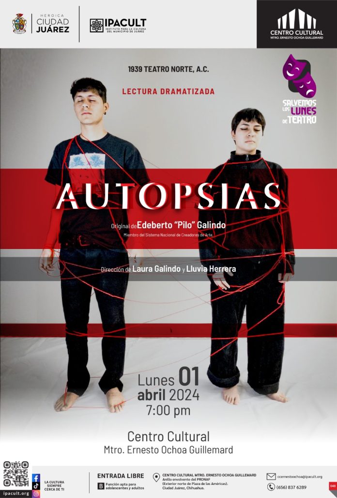 La lectura dramatizada “Autopsias” se presenta este lunes a las 7:00 de la tarde en el Centro Cultural Ernesto Ochoa Guillemard, ubicado en la Zona Pronaf.