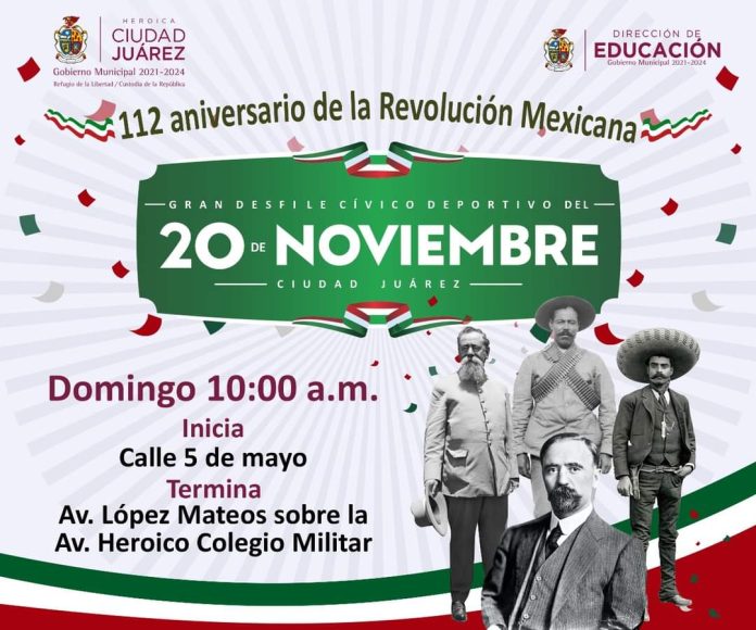 Ciudad Juárez, Chih. – El desfile en conmemoración por el 112 aniversario de la Revolución Mexicana, se llevará a cabo sobre la avenida Heroico Colegio Militar, iniciando en la calle 5 de Mayo para concluir en la avenida López Mateos, anunció la Dirección de Educación Municipal.