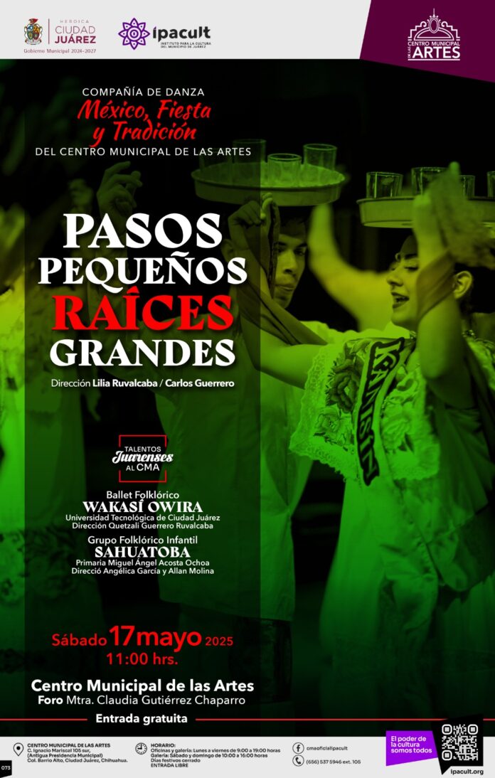 El Instituto para la Cultura del Municipio de Juárez (IPACULT) invita a toda la comunidad a disfrutar del espectáculo de danza “Pasos pequeños, Raíces grandes”, que se presentará de manera gratuita el próximo sábado 17 de mayo a las 11:00 de la mañana en el Centro Municipal de las Artes (CMA).