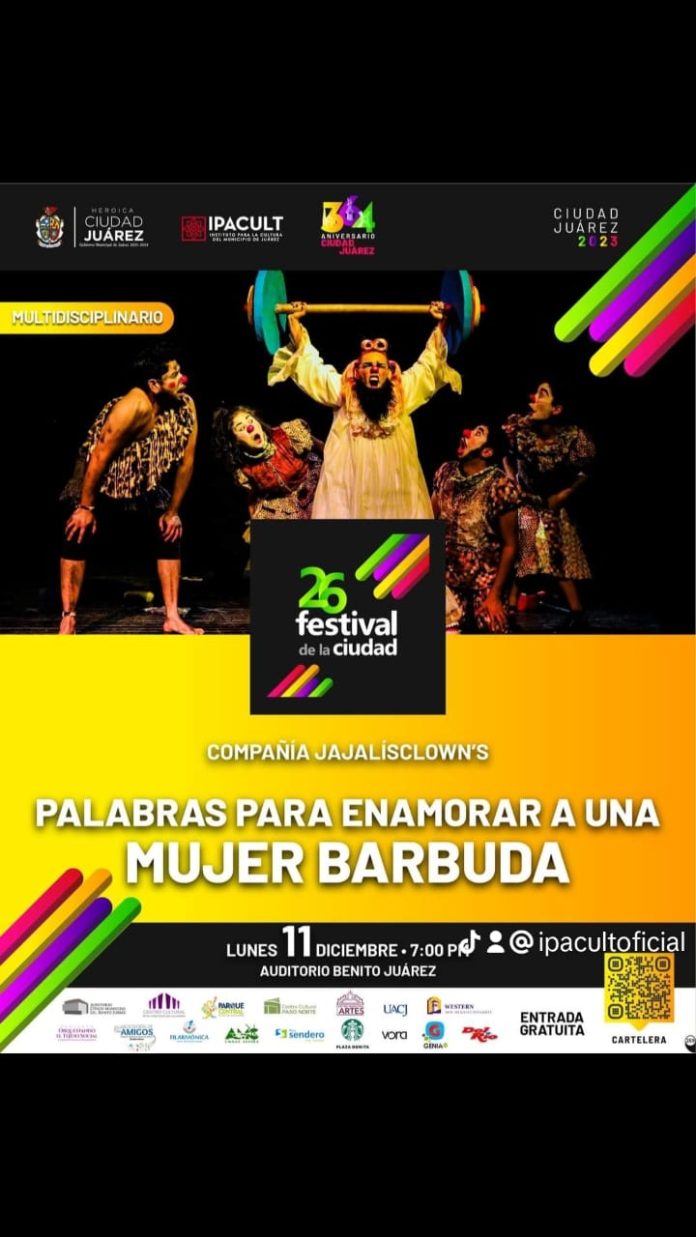 Ciudad Juárez, Chih .- Hoy a las 7:00 de la tarde, la compañía de teatro JAJALISCLOWN’S, llenará de risas el escenario del Auditorio Benito Juárez, con la puesta en escena de Palabras para enamorar a una mujer barbuda, historia que sin duda alegrará al público de todas las edades.