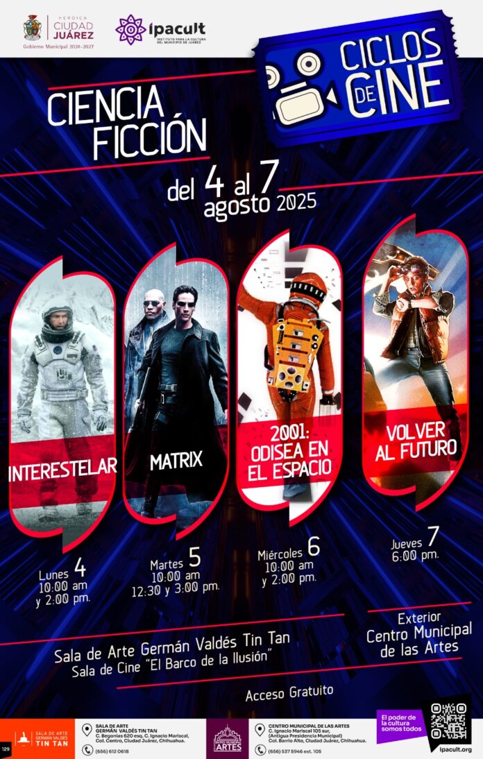 El Instituto para la Cultura del Municipio de Juárez (IPACULT), a través de su programa “Ciclos de Cine”, invita a la ciudadanía a vivir una experiencia cinematográfica fuera de este mundo, con la proyección de películas de ciencia ficción del 4 al 7 de agosto, en la sala del Barco de la Ilusión, ubicada dentro de la Sala de Arte Germán Valdés “Tin Tan” y en la explanada del Centro Municipal de las Artes (CMA).
