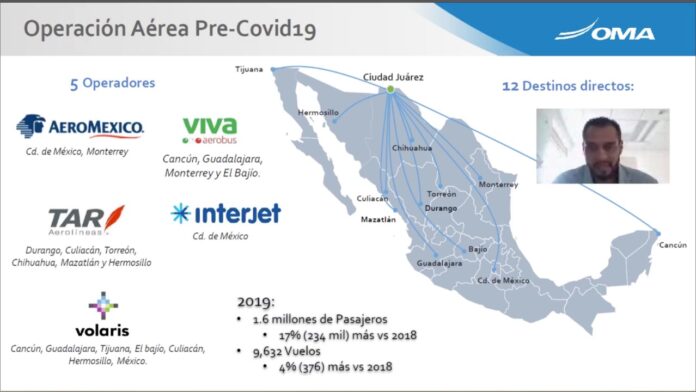 Ciudad Juárez, Chih. (UACJ) – La pandemia por el COVID-19 provocó que la actividad en el aeropuerto de esta ciudad registrara en mayo una caída de hasta el 95 por ciento y que prácticamente estuviera cerrado, pero en los meses recientes la actividad se ha venido recuperando, dijo en conferencia virtual el administrador de la terminal aérea de Ciudad Juárez, Luifil Orlando Britto Navarro.