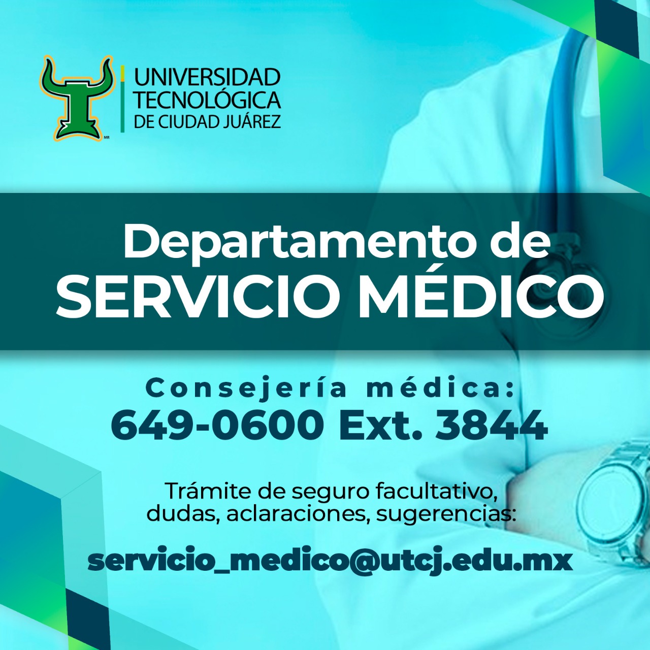 Ciudad Juárez, Chih. – Pese a que los programas educativos se están llevando a cabo a distancia, en acato a las disposiciones emitidas por las autoridades sanitarias y educativas ante la pandemia por COVID-19 que actualmente se vive a nivel mundial, la Universidad Tecnológica de Ciudad Juárez, a través de su Departamento de Servicios Médicos, continúa brindando atención a todos los miembros de su comunidad, principalmente en el aspecto preventivo.