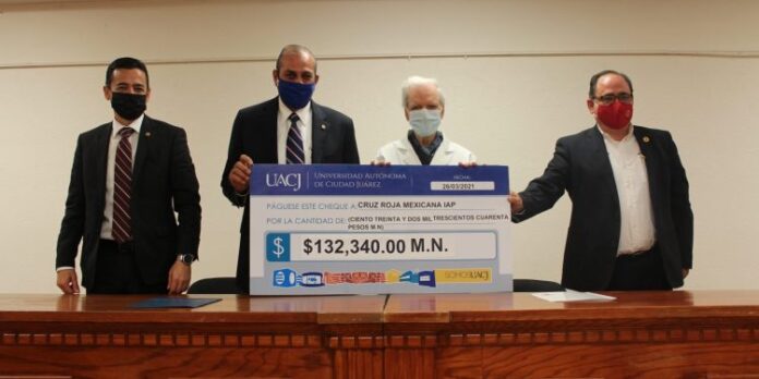 Ciudad Juárez, Chih. (UACJ) – Con aportaciones voluntarias de su comunidad estudiantil, la Universidad Autónoma de Ciudad Juárez hizo un donativo por 132 mil 340 pesos a la Cruz Roja Mexicana, delegación Ciudad Juárez.
