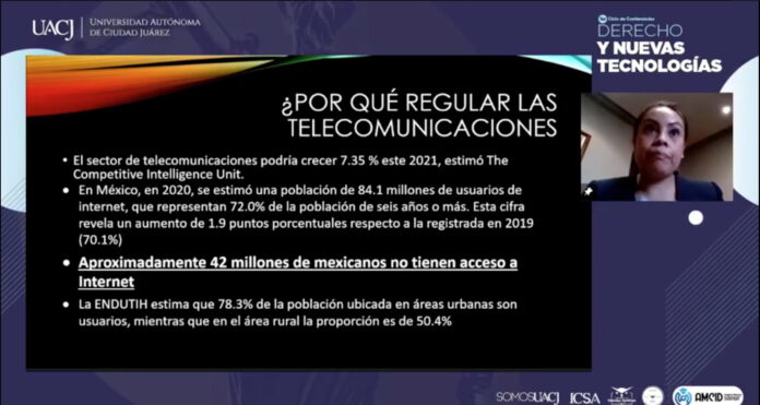 Ciudad Juárez, Chih. (UACJ) – En el país, aproximadamente 42 millones de mexicanos no tienen acceso a Internet, dijo la experta en telecomunicaciones Ileana Gisela San Juan Rivera en la conferencia que ofreció dentro del Ciclo Derecho y Nuevas Tecnologías, que se lleva a cabo en la UACJ.
