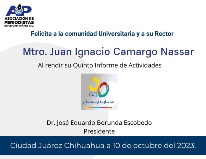 La Asociación de Periodistas de Ciudad Juárez A.C. (APCJ), encabezada por el Dr. Eduardo Borunda Escobedo, extiende sus felicitaciones a la comunidad universitaria y al Mtro. Juan Ignacio Camargo Nassar tras su quinto informe de actividades.