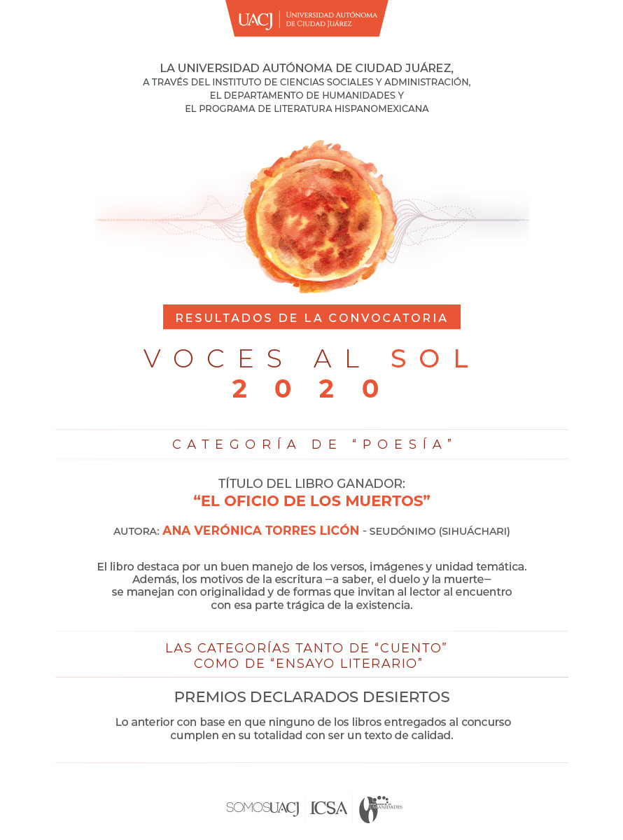 Ciudad Juárez, Chih. (UACJ) – “El oficio de los muertos”, de la autora Ana Verónica Torres Licón, fue el libro ganador de la convocatoria Voces al sol 2020 en la categoría de poesía.