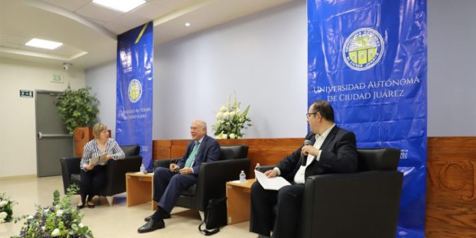 Ciudad Juárez, Chih. (UACJ) – El exsecretario general de la Organización para la Cooperación y Desarrollo Económico (OCDE) y de Relaciones Exteriores y de Hacienda y Crédito Público de México, José Ángel Gurría Treviño, afirmó en una conferencia, ofrecida en la Universidad Autónoma de Ciudad Juárez, que mientras mayor sea la recuperación de la economía y la inversión en el mundo mejor le irá a México y, desde luego, a Chihuahua por su cercanía con el mayor mercado internacional.