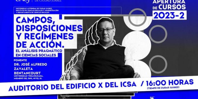 Ciudad Juárez, Chih. (UACJ) – El Departamento de Ciencias Sociales convoca a la conferencia magistral del doctor José Alfredo Zavaleta Betancourt titulada Campos, disposiciones y regímenes de acción con la que se marcará el inicio de las actividades académicas del semestre agosto-diciembre de 2023.