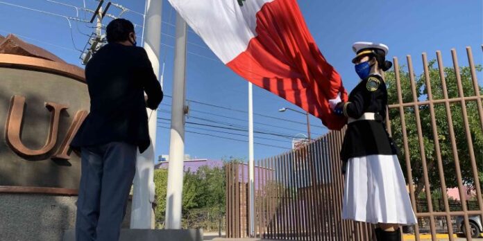 Ciudad Juárez, Chih. (UACJ) – En el margen del Día de la Independencia de México, este día se llevó a cabo el izamiento a la bandera en la Rectoría de la Universidad Autónoma de Ciudad Juárez, por segunda ocasión este año sin público, debido a las medidas sanitarias para evitar la propagación del Coronavirus.