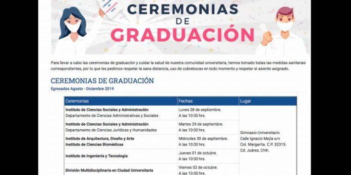 Ciudad Juárez, Chih. (UACJ) – Luego de gestionar los permisos necesarios ante Protección Civil y la Secretaría de Salud, la UACJ anuncia que las ceremonias de graduación que se suspendieron al inicio de la cuarentena se realizarán del 28 de septiembre al 2 de octubre en el Gimnasio Universitario, a las 10:00 de la mañana.