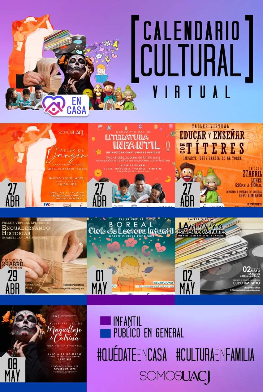 Ciudad Juárez, Chih. (UACJ) –Con los hashtags #Quédateencasa y #Culturaenfamilia, la Subdirección de Formación y Vinculación Cultural de la Universidad Autónoma de Ciudad Juárez (UACJ), anuncia y mantiene en oferta una amplia gama de talleres en línea de forma gratuita para toda la comunidad juarense, con el fin de cubrir sus necesidades de aprendizaje en diversas disciplinas y ramas artísticas durante la Jornada Nacional de Sana Distancia.