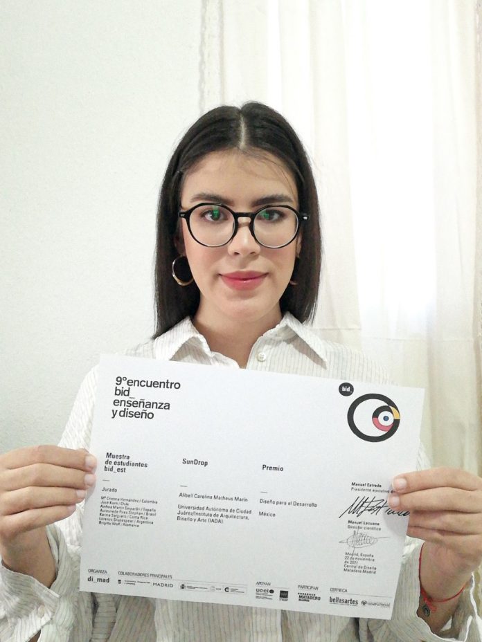 Ciudad Juárez, Chih. (UACJ) – Alibell Carolina Matheus Marín, egresada de la UACJ, recibió el Premio Diseño Para el Desarrollo durante el 9.º Encuentro Bienal Iberoamericano de Diseño, realizado en Madrid, España, del 22 al 24 de noviembre.
