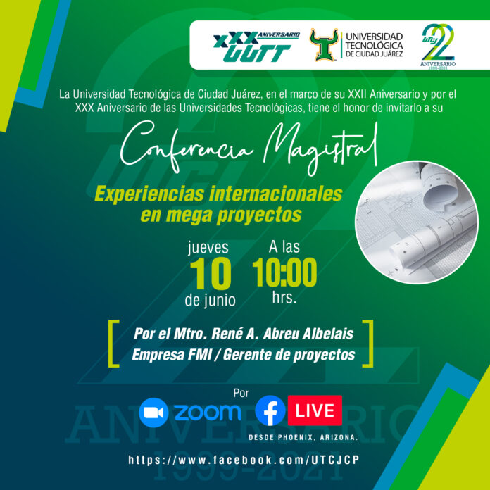 Ciudad Juárez, Chih. – En el marco de su XXII aniversario, y por los 30 años que cumplen las Universidades Tecnológicas en el país, la Universidad Tecnológica de Ciudad Juárez (UTCJ) presentó hoy la conferencia magistral “Experiencias Internacionales en Megaproyectos”, la cual estuvo a cargo de un hombre que ha ocupado importantes puestos en grandes compañías, quien compartió sus vivencias laborales que tuvo en distintas partes del mundo.
