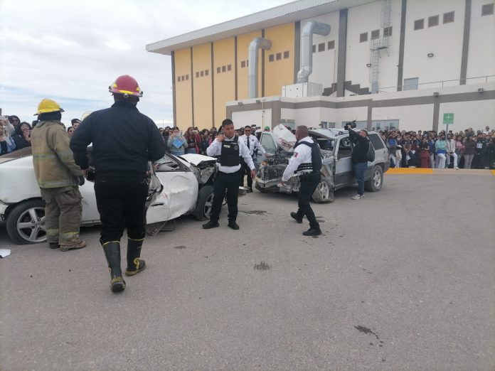 Ciudad Juárez, Chih .- El evento, que se llevó a cabo este martes en el estacionamiento del Gimnasio de Ciudad Universitaria, al sur de la ciudad, consistió en la escenificación de una tríada trágica en la que participaron la corporación, el Servicio Médico Forense, el Departamento de Bomberos y estudiantes de la UACJ.