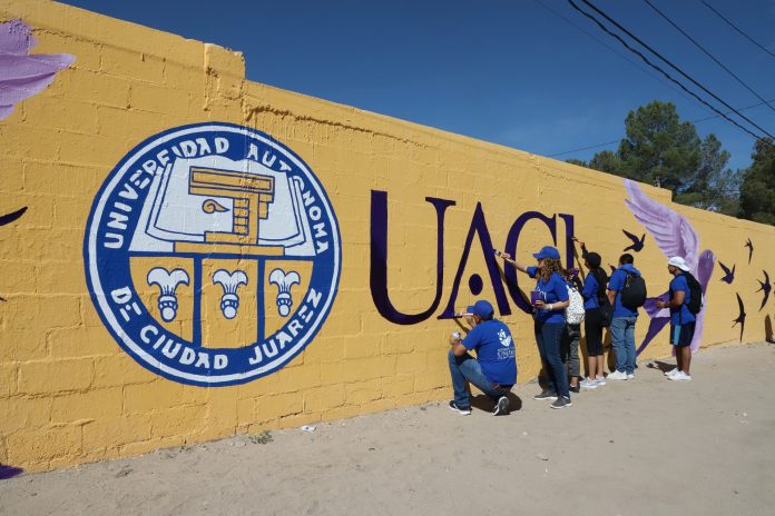 En esta ocasión, la mañana del viernes 29 de julio, autoridades y 50 alumnos de la UACJ, participaron en la pinta simbólica de un mural de 40 metros de largo por 3 metros de ancho, localizado en el bulevar Norzagaray, esquina con calle Coyotla, en la colonia Felipe Ángeles.